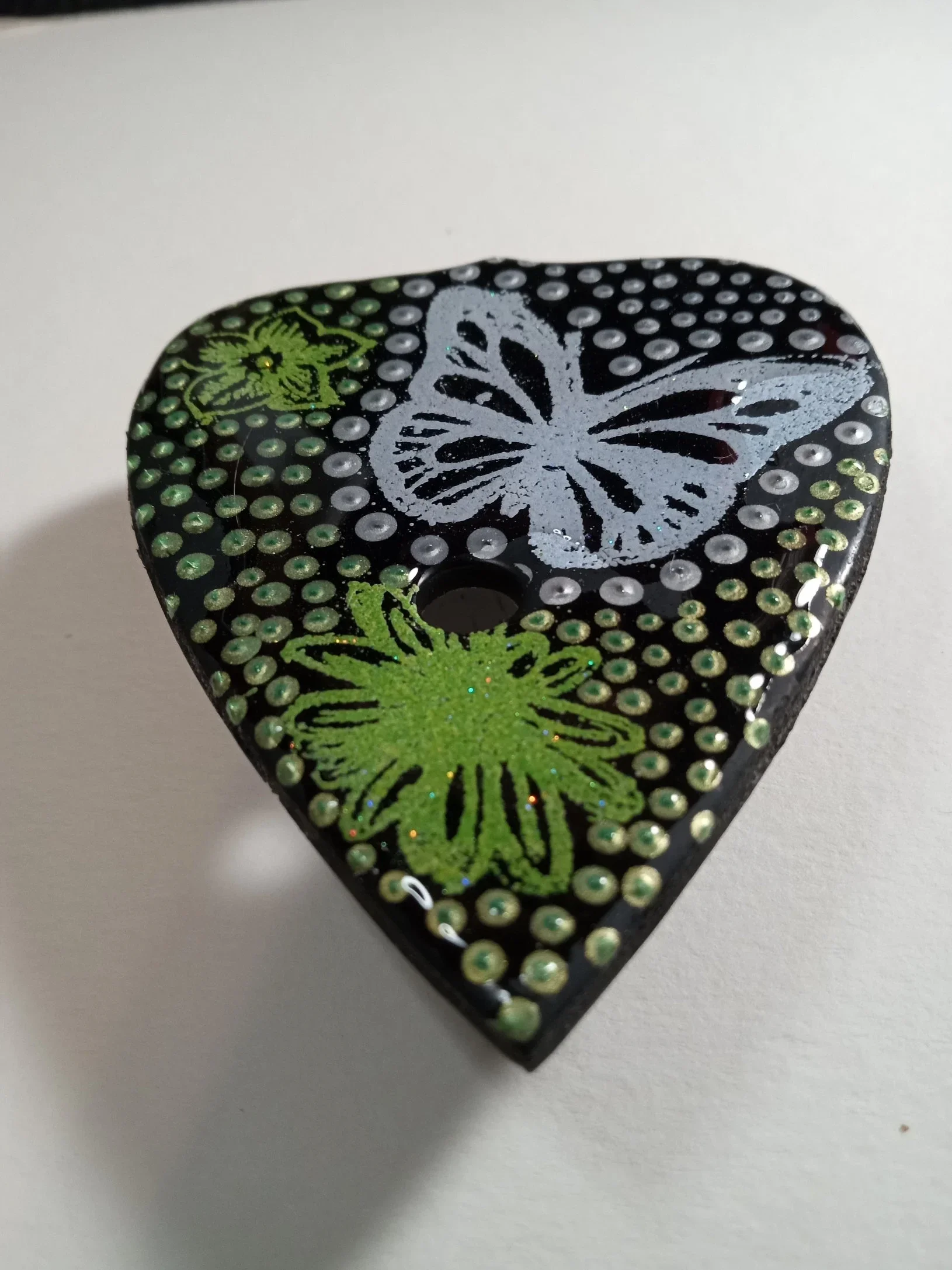This intuitive writing planchette combines polymer clay with embossing, acrylic dot painting, and epoxy resin to create a unique one-of-a-kind planchette. Glass balls attached underneath make for a smooth writing experience.